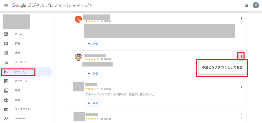 - 「不適切なクチコミとして報告」をクリック